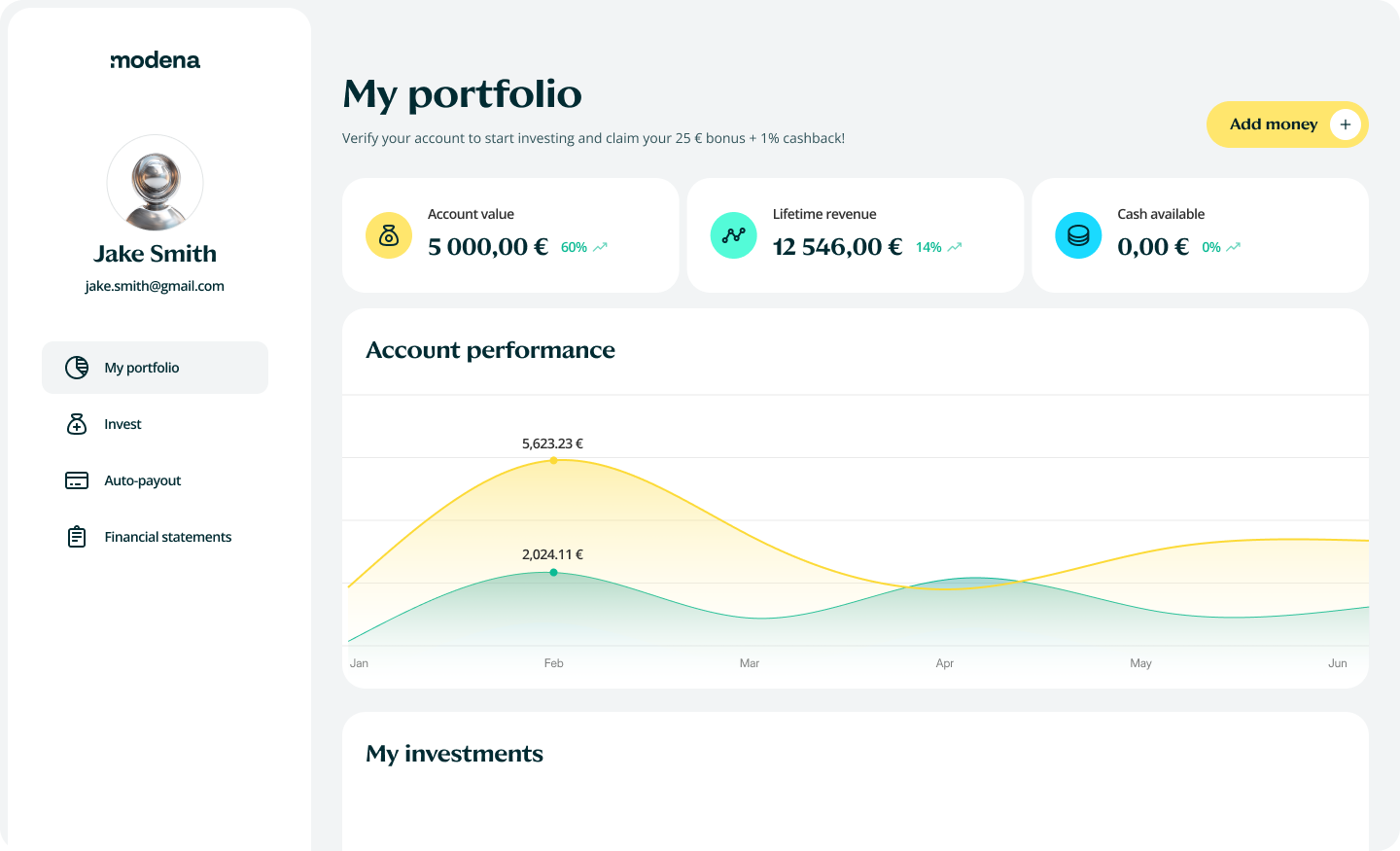 Start with 50 € You can start on Modena's platform with as little as 50 €. It's always possible to increase the committed amount at any time later -